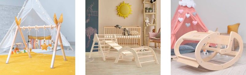 Ανάλογα με την ηλικία, διατίθενται διάφοροι τύποι γυμναστηρίων εμπνευσμένων από τη μέθοδο Montessori. Έτσι, μπορείτε να βρείτε το baby gym από φυσικό πεύκο, το οποίο ενσωματώνει τέσσερα κρεμαστά παιχνίδια.